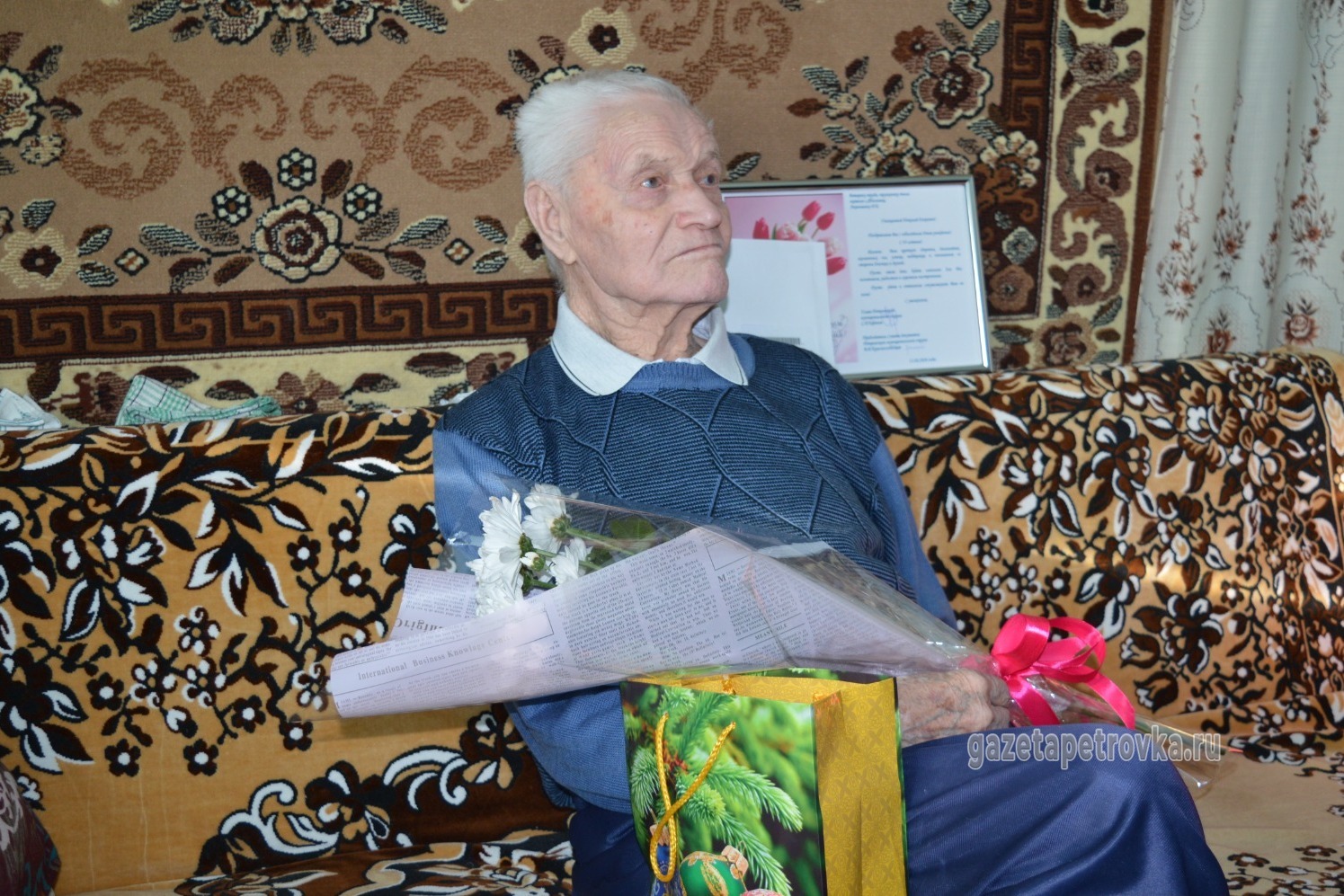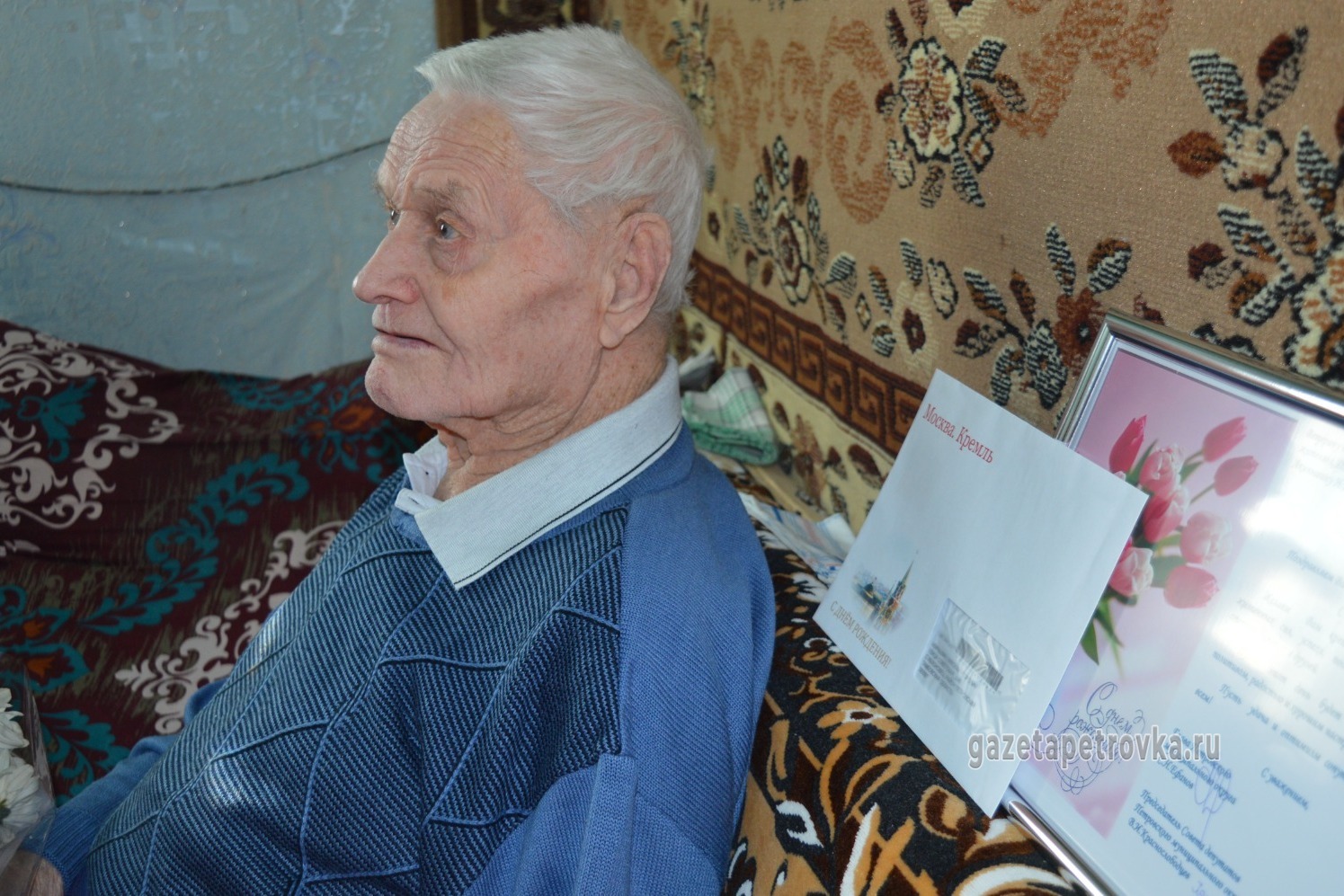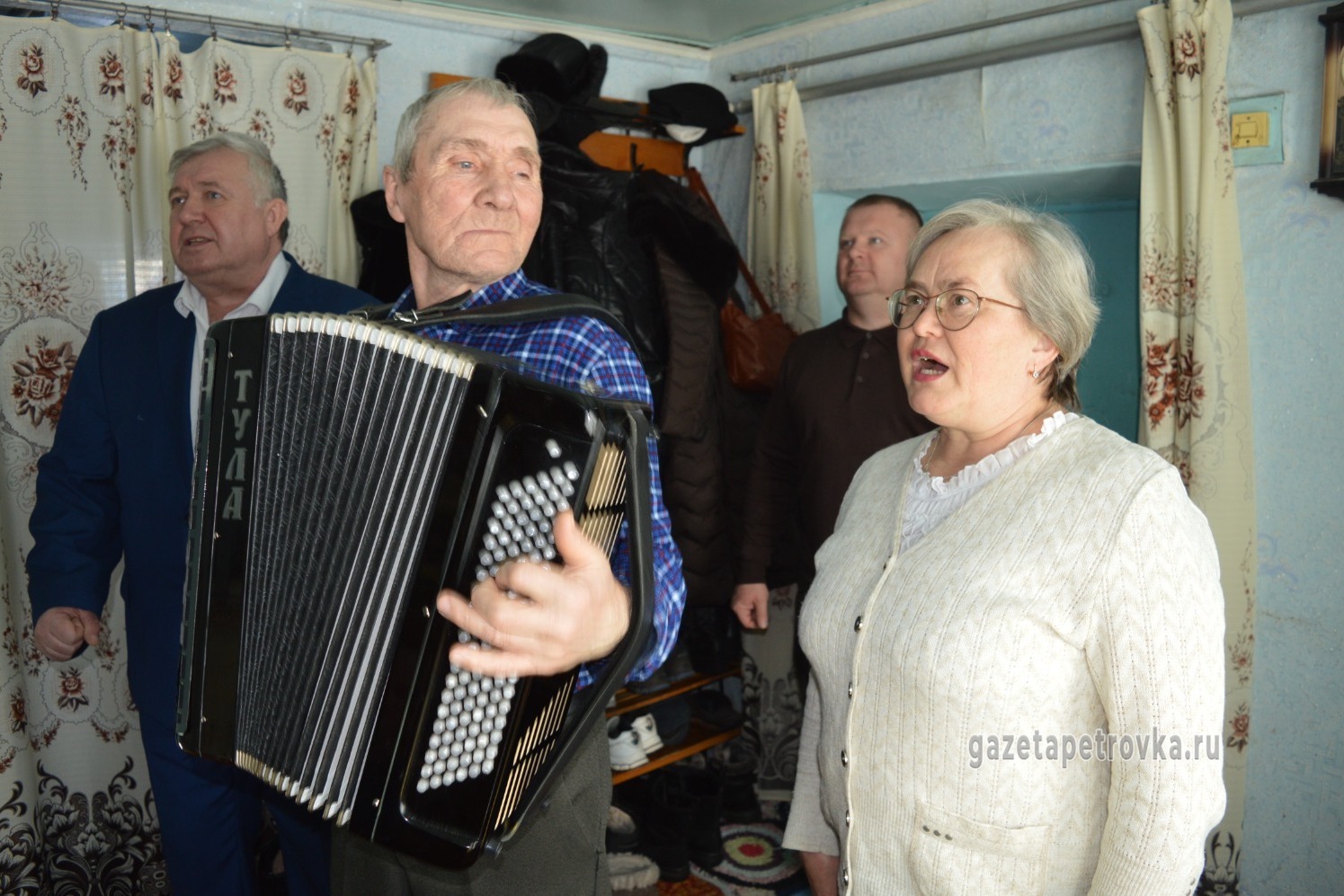 В день юбилея письмо с поздравлением дедушка получил из московского Кремля. Труженика поздравил президент РФ Владимир Путин. Уважаемого долгожителя навестили управляющая делами администрации Петровского муниципального округа Наталия Дворецкая, начальник Шехманского теротдела Алексей Рябухин, представитель местной ветеранской организации Светлана Мирошниченко. Знаменитые композиции исполнили сотрудники Петровского досугового центра, Олег Фролов и Анатолий Мосякин. Дедушке передали поздравительный адрес от руководителей округа и памятные подарки.