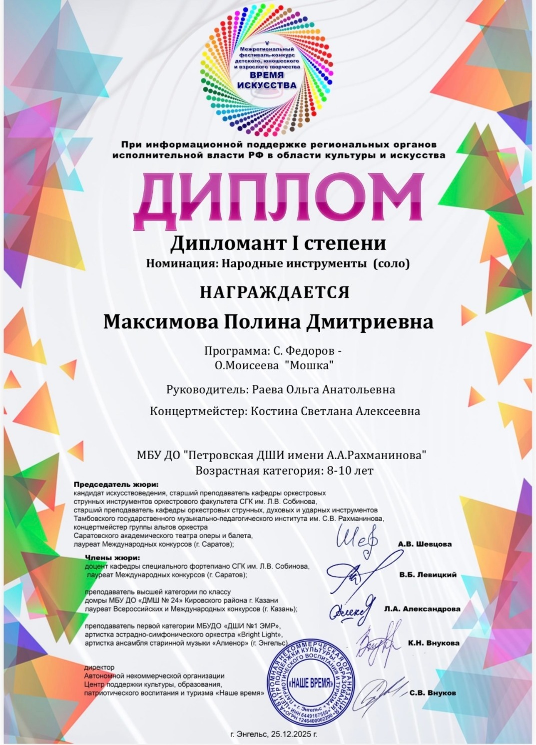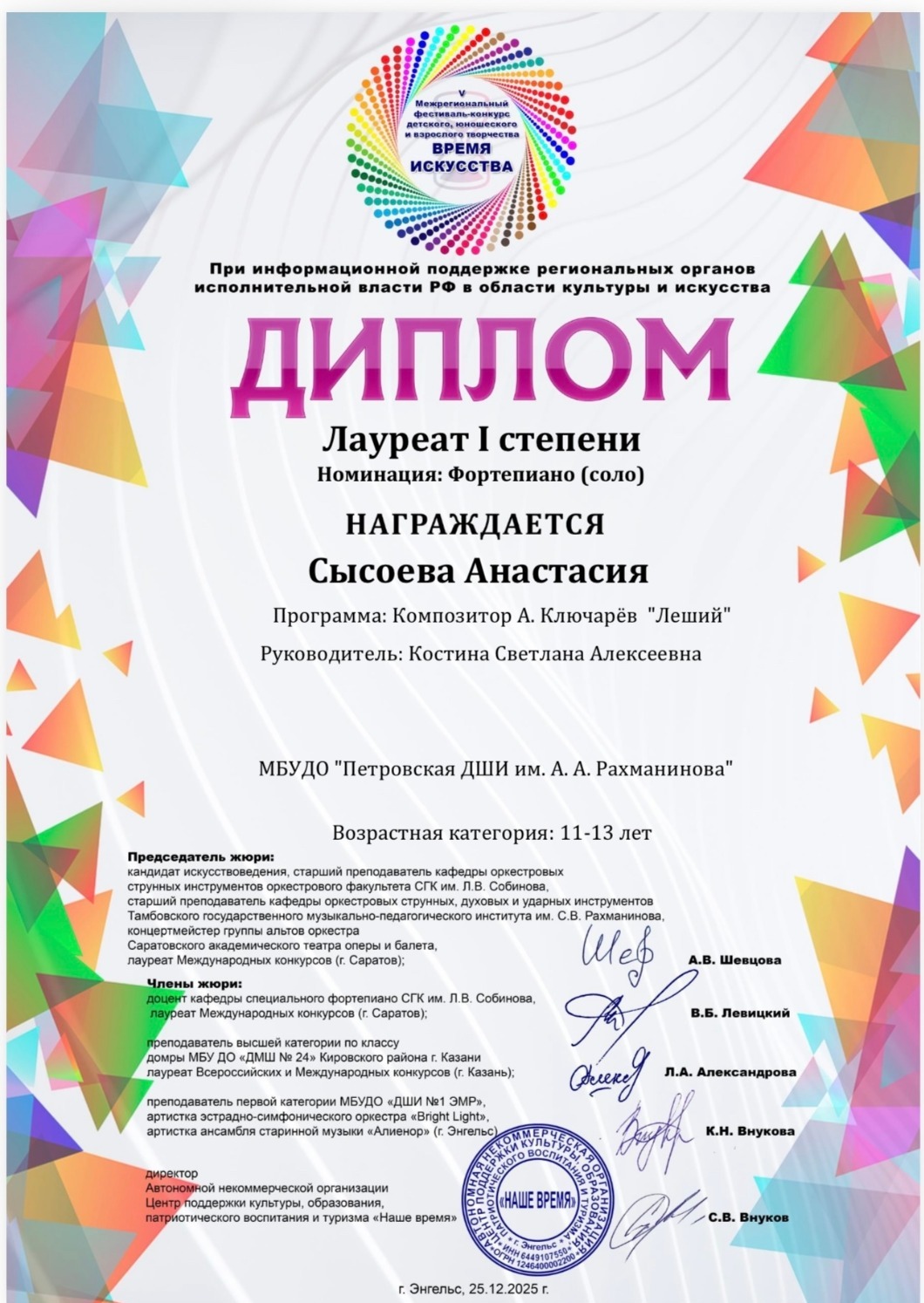 — Финальным аккордом 2025 года стали победы наших учеников на межрегиональном фестивале «Время искусства»! Этими выступлением мы не только подвели итоги, но и зарядили старт нового 2026 года мощной творческой энергией. Темп задан! — отметила директор образовательного учреждения Наталия Терехова.
