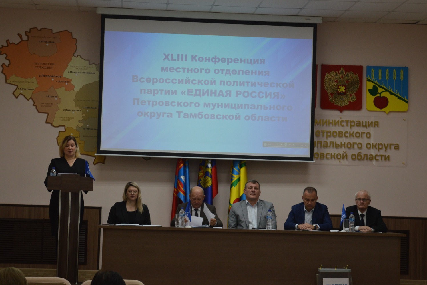 В Петровском муниципальном округе 14 ноября состоялась XLIII конференция местного отделения Всероссийской политической партии «Единая Россия». Председателем конференции избрана исполнительный секретарь местного отделения партии Елена Кокорева. В работе конференции приняли участие первый заместитель председателя Тамбовской областной Думы Александр Куприянов и депутат Тамбовской областной Думы Андрей Новичков, делегаты от первичных отделений партии, члены местного политического совета, местной контрольной комиссии, депутаты Совета депутатов Петровского муниципального округа.