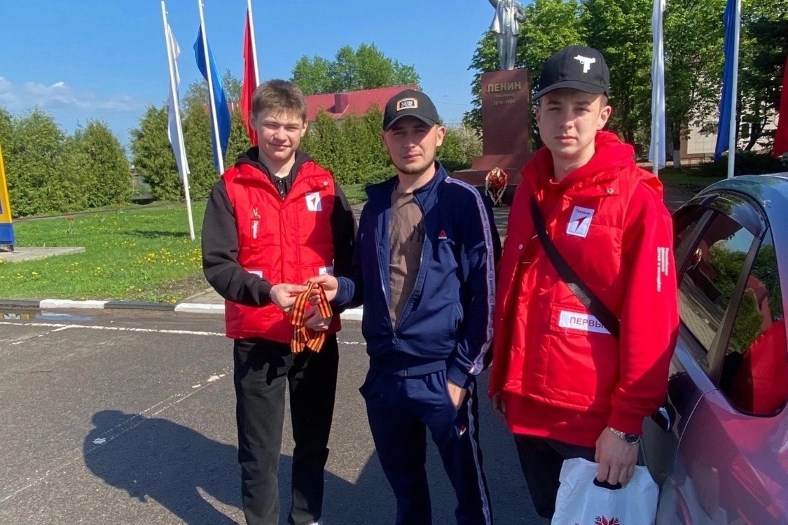 Волонтёры Победы и участники Движения Первых вручают ленточки сотрудникам организаций и жителям населённых пунктов округа.
