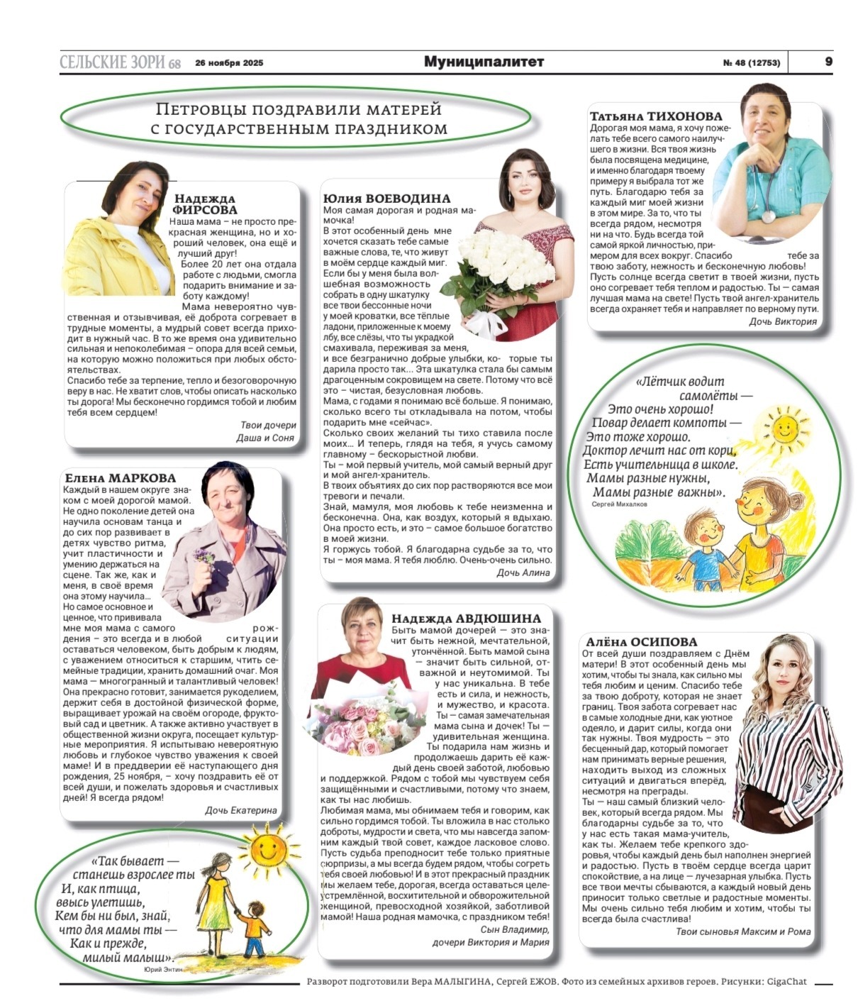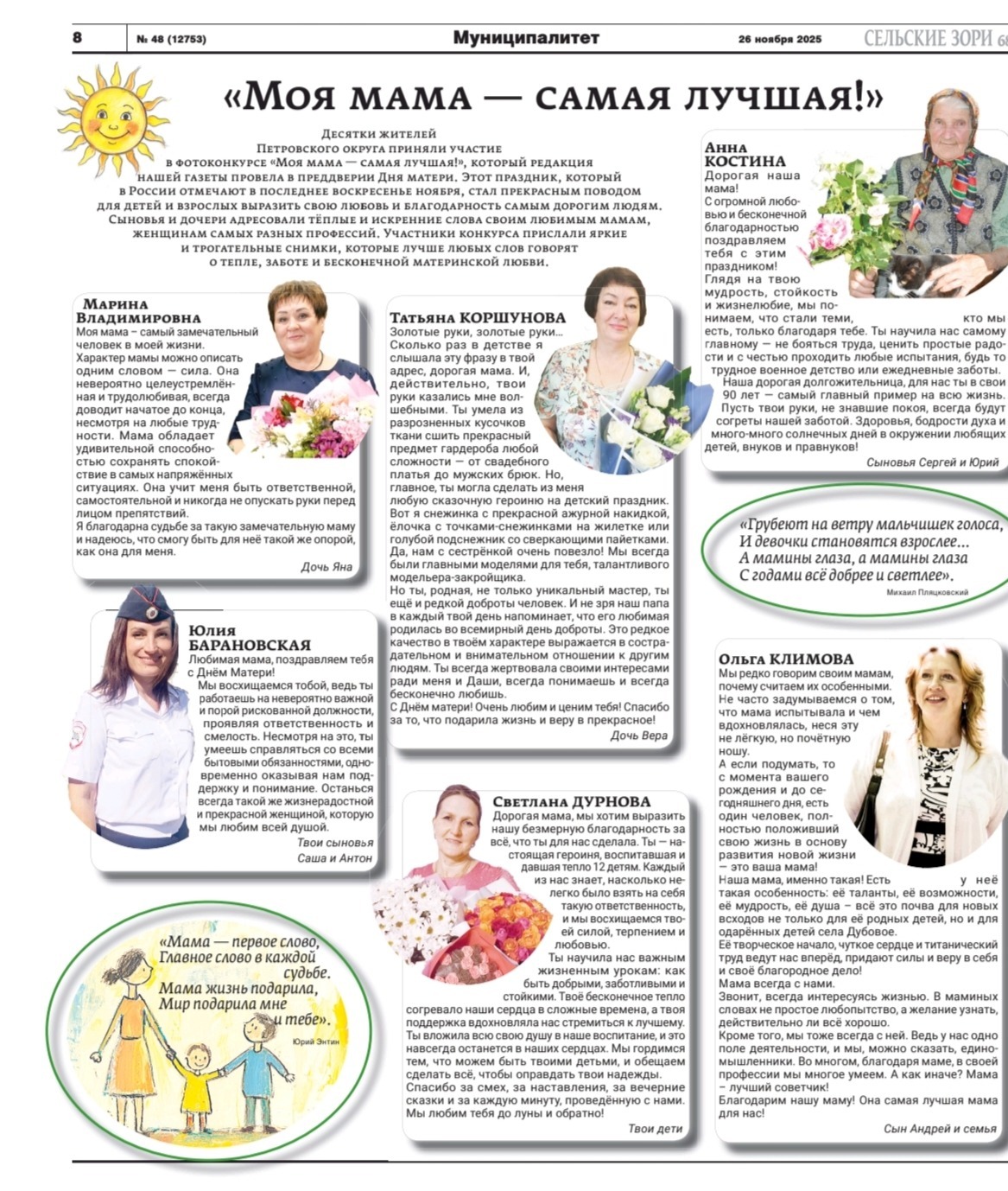 В течение двух недель в редакцию приходили поздравления, каждые из которых были наполнены теплом, благодарностью и безграничной любовью. На снимках запечатлены самые душевные моменты: мамины объятия, совместные путешествия, семейные застолья, переданные через поколение, и радость от простых мгновений.