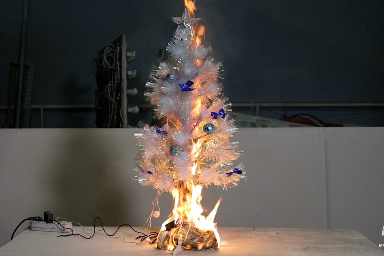 В рамках исследования, организованного на площадке Всероссийского научно-исследовательского института противопожарной обороны МЧС России, был смоделирован пожар в условиях новогоднего праздника. Для этого три елки из ПВХ и одно настоящее дерево были украшены типичными новогодними украшениями, включая мишуру и игрушки. Причиной возгорания послужила имитация неисправности электропроводки, вызванная перегревом гирлянды и сетевого фильтра.
