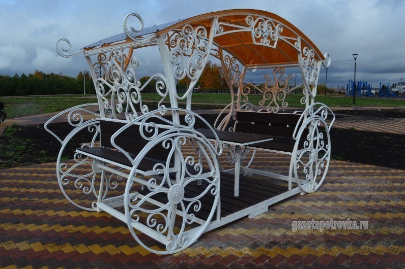 Эстетику и комфорт также создают малые архитектурные формы: декоративные арки, деревянный настил и бетонные скульптуры Елены Маковой. Уникальным украшением парка стала металлическая беседка-карета, изготовленная местными мастерами, супругами Бодрягиными.