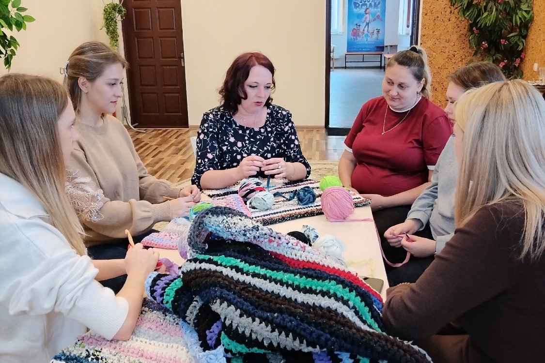 После официальной части для гостей провели творческий мастер-класс. Рукодельница из села Дубовое Елена Тимофеева показала будущим мамам, как вязать коврики из лоскутков.